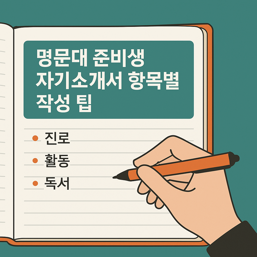 수시 전형에서 자기소개서는 단순한 서류가 아니라, 학생이 어떤 사람인지 보여주는 결정적 도구입니다. 특히 서울대, 연세대, 고려대 등 명문대를 목표로 하는 학생이라면, 자기소개서의 완성도가 당락을 좌우할 수 있습니다. 하지만 막상 쓰려면 어디서부터 시작해야 할지 막막한 경우가 많습니다. 이 글에서는 명문대 준비생들이 자기소개서를 쓸 때 가장 어려워하는 세 가지 항목, 즉 진로탐색 경험, 활동 중심 서술, 독서 기록을 중심으로 항목별 작성 팁을 구체적으로 안내해드립니다.
